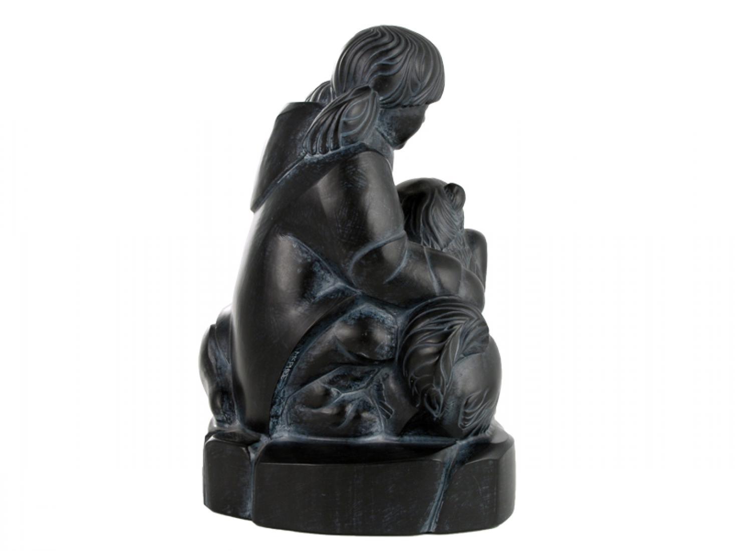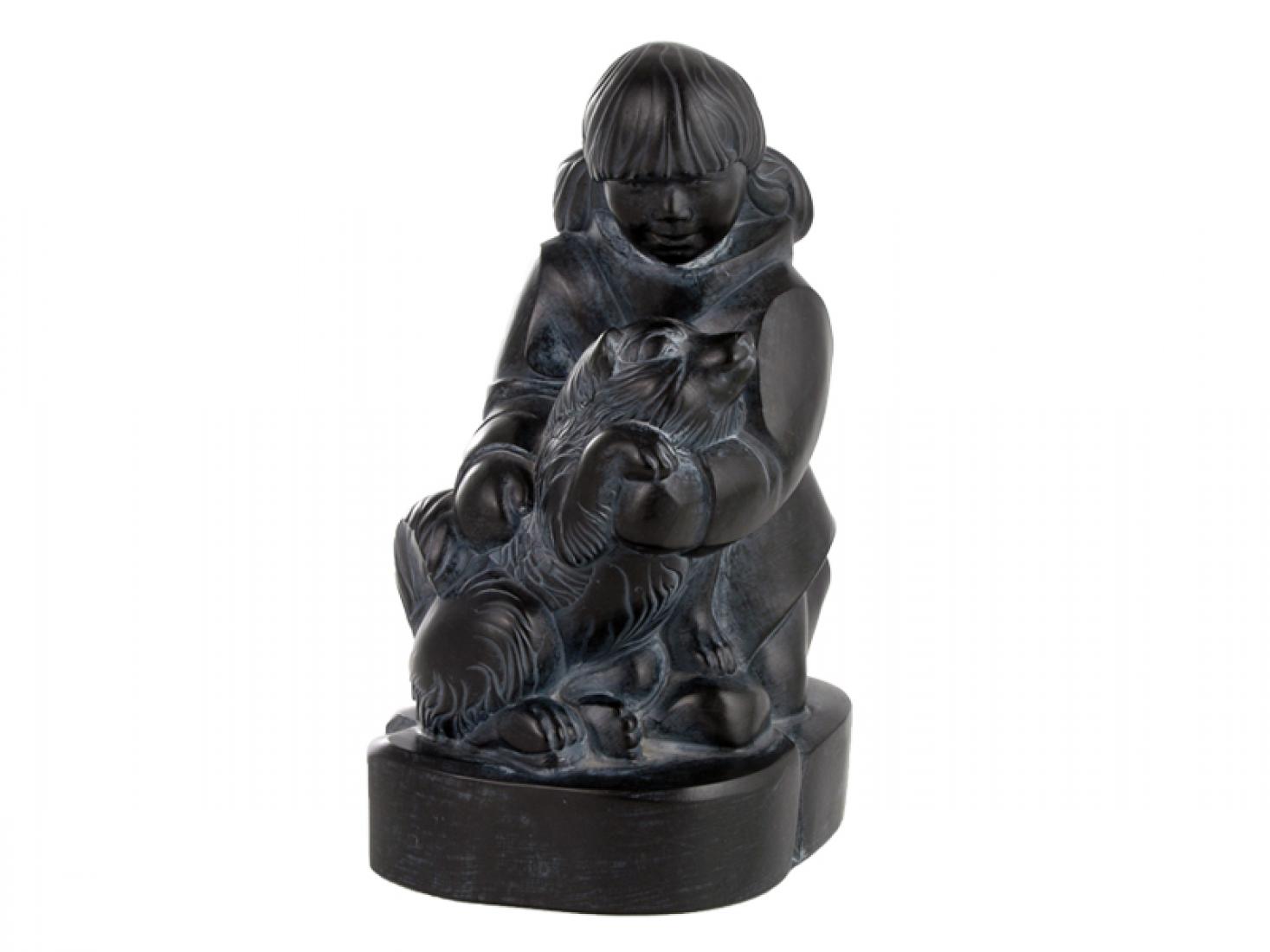 Sculpture of Inuit Girl and Husky in carved stone styling, beautifully carved. Made in Canada. 6" x 4"