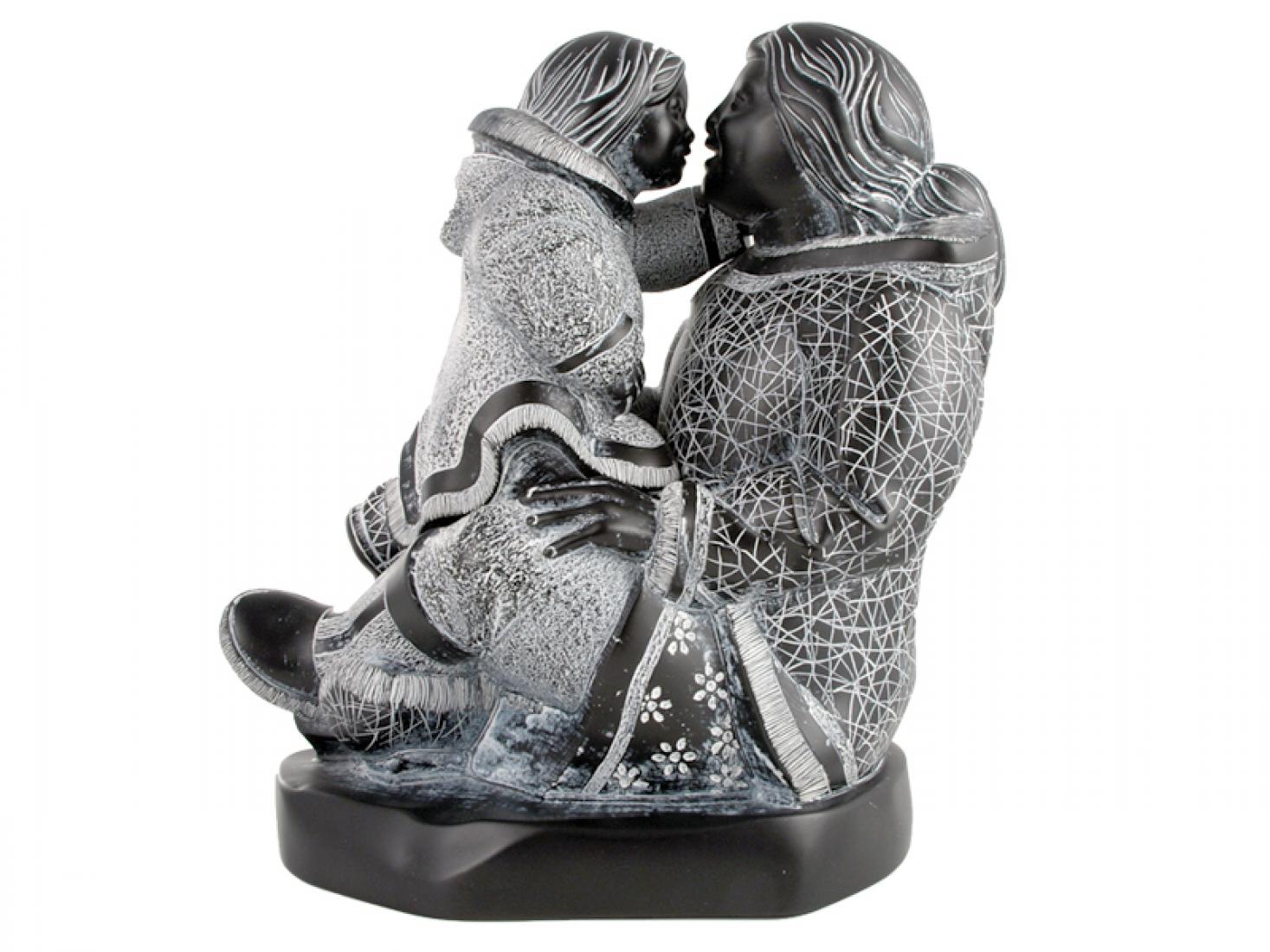 Sculpture of Inuit mother and child in carved stone styling with intricate detailing. Made in Canada. 8" x 5" x 7".