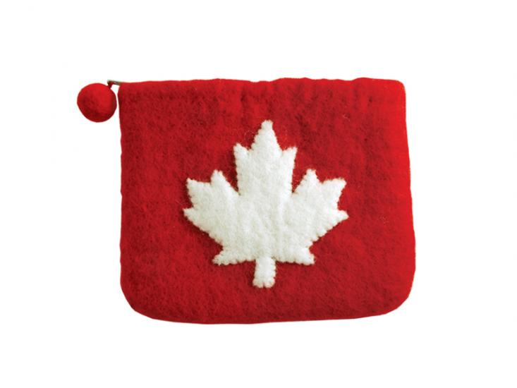Felted Maple Leaf Red Zip Pouch. 5" x 6"