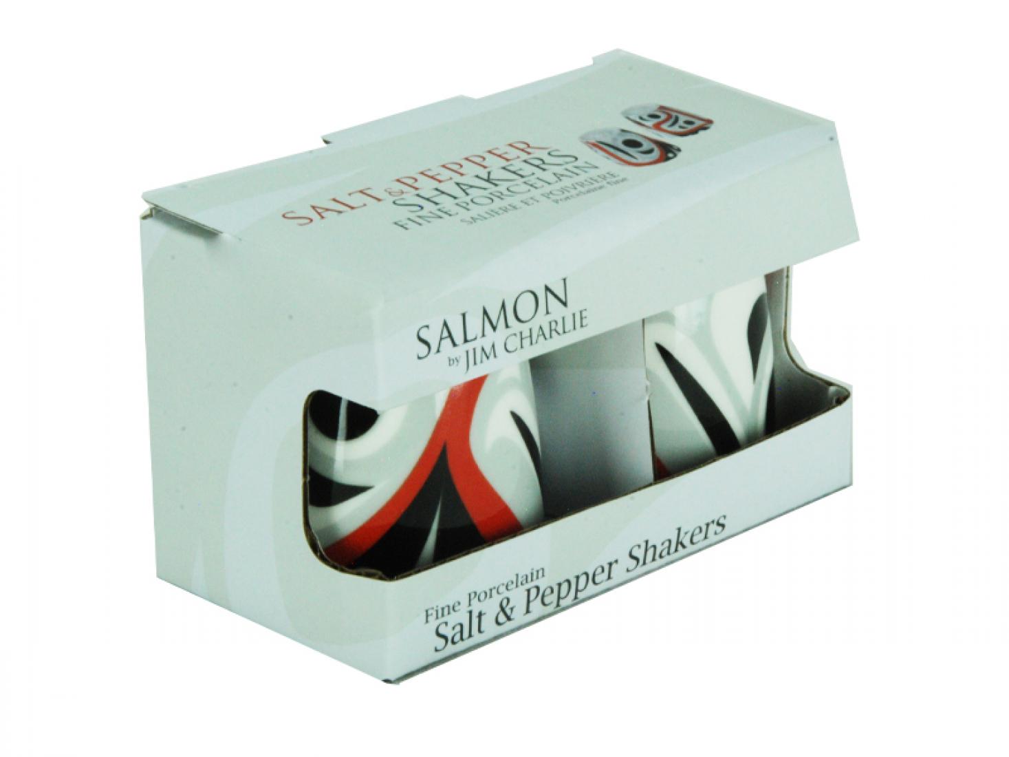 JC Salmon Salt & Pepper Shakers Jim Charlie SKU: 45-45-366 $19.00Ceramic Salt & Pepper Shakers with Salmon design by artist Jim Charlie. Qty